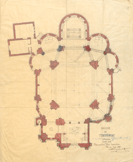 Ce plan destiné à l’origine pour Tinténiac illustre parfaitement le travail de d’Arthur Regnault. Comme le montre la rature du titre, le document servit finalement à l’édification entre 1888 et 1892 de la nouvelle église de Liffré, à la place d’un bâtiment largement dégradé datant du XVIe siècle. Le financement de la construction d’une église à l’époque du Concordat pouvait parfois être difficile et l’intervention manuscrite de l’auteur illustre les vicissitudes de la vie d’un architecte de bâtiments religieux, particulièrement sous la IIIe République. La société restait encore très largement christianisée, mais connaissait une phase de sécularisation accélérée mise en œuvre par l’État républicain entre 1880 et 1910.
