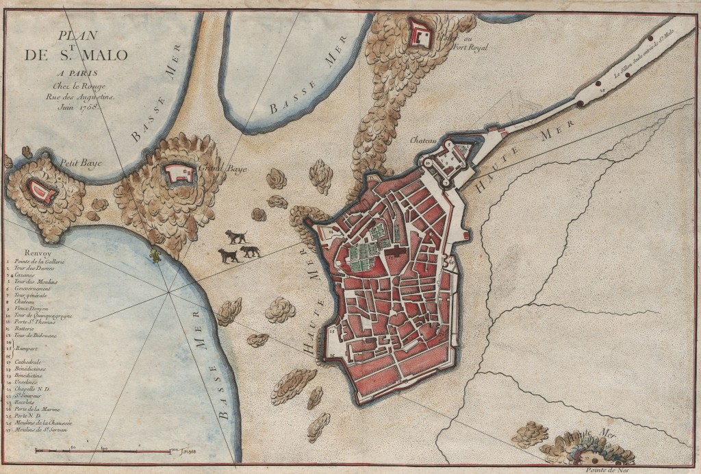 La toponymie est un indice précieux de la position particulière qu’assume la cité corsaire, entre terre et mer, mais aussi entre France et Bretagne. La tour de « Quinquagrogne » porte ce nom en souvenir de la grogne que sa construction avait suscitée. Aux rugissements des Malouins, Anne, duchesse de, Bretagne, puis reine de France, opposa cette réplique : « Qui qu’en groigne, ainsi sera, car tel est mon bon plaisir ». Abritée derrière ses murailles construites à partir du XIIe siècle, la ville s’est progressivement développée et densifiée. Sur ce minuscule rocher, au péril des flots, vivent confinés près de 15 000 habitants. Siméon Garangeau, mort en 1741 au sein de la cité, vient à peine d’achever la protection de la cité sous les ordres de Vauban : grâce à son « rampart » de granit, la ville a vu sa superficie d’étendre et passer de 16 à 24 hectares, englobant le nouveau quartier de Dinan. Ces Messieurs de Saint Malo ont profité des travaux pour perfectionner les installations portuaires : le quai est prolongé de la « Tour des Moulins » en direction du Sillon ; s’y ajoutent ensuite ceux de Dinan et de Saint-Louis. La cité corsaire se complexifie au sein de cet espace restreint : autour de la « Cathédrale », les « Ursulines » ou la « chapelle Notre-Dame » forment un ovale et dessinent un quartier retiré à l’écart du reste de la ville, une « ville sainte » au sein de la « ville ceinte ». La nature est aussi présente à sa manière au sein de cet espace entièrement construit et aménagé : on devine sur la carte, mis en avant par quelques touches de peinture verte, le « Petit et le Grand Jardin » de Sainte Anne, le « Jardin et les bâtiments du Doyenné », le « Cloître et les Jardins des Bénédictions ». Cette carte ne peut pourtant se résumer à un simple relevé des tours et détours au sein des murailles de Saint-Malo.