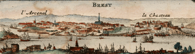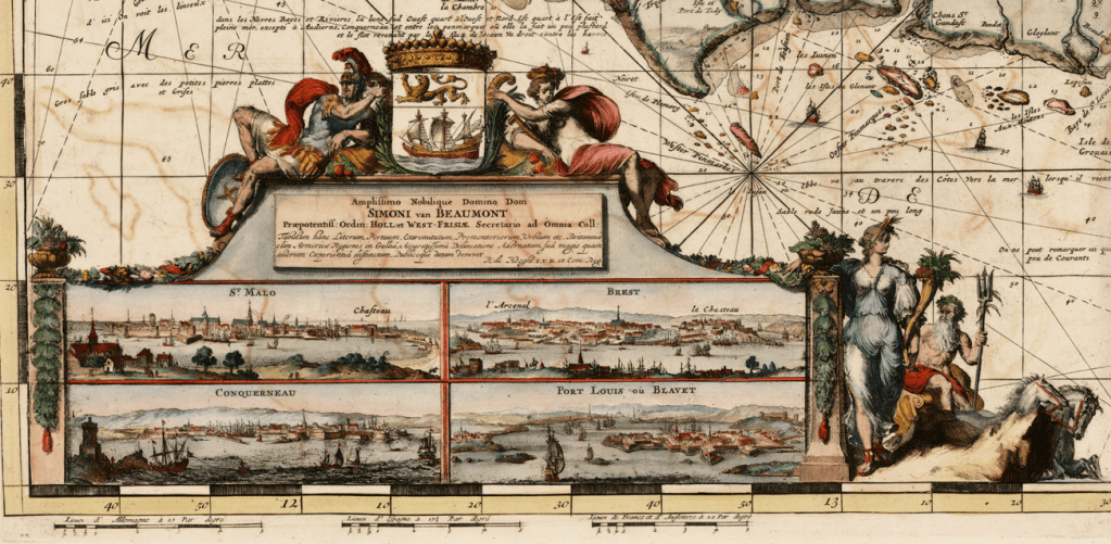 Le destin de la Bretagne bascule. Si les Hollandais ont ravi aux Bretons depuis longtemps leur rôle de « roulier des mers », la Bretagne était encore un producteur important de toiles, notamment de voiles maritimes. La présence de la corne d’abondance aux côtés de Neptune suggère la prospérité que la province a tirée de ses échanges commerciaux réalisés par voie maritime, avec l’Angleterre comme avec les Pays-Bas. Certains ports sont encore importants : « Conquerneau », et surtout « Saint-Malo », représentés dans le cartouche, avec leurs armements nautiques pléthoriques et surtout leurs fortifications. « Brest » ou « Port-Louis », berceau du futur Lorient, véritables villes-neuve du XVIIe siècle, montrent l’importance grandissante de l’État français au sein de l’économie régionale. Pourtant, il ne faut pas se leurrer : les guerres de Louis XIV ferment à la Bretagne les marchés nordiques, ses toiles sont progressivement concurrencées et remplacées. L’âge d’or de la Bretagne prend fin.