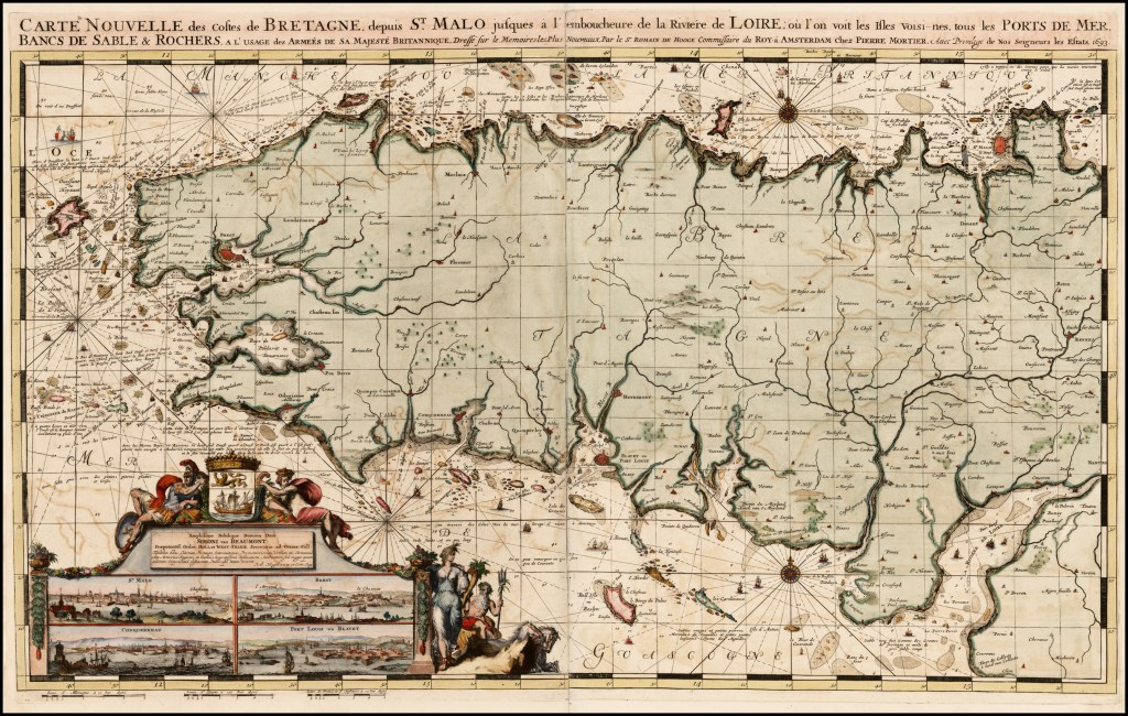 Cette carte des côtes de Bretagne a été réalisée par Romain de Hooghe, « commissaire du roi à Amsterdam », tirée du Neptune françois, ou, Atlas nouveau des cartes marines, et publiée par Pierre Mortier à Amsterdam en 1693. Cette carte peut surprendre au premier abord : « à l’usage des armées britanniques », elle est néanmoins publiée à Amsterdam ; dédiée à Simon van Beaumont, secrétaire des États de Hollande et de Frise occidentale, elle est pourtant largement écrite en français. L’histoire de l’ouvrage est en fait particulière : « le Neptune François ou atlas nouveau des cartes marines levées et gravées par ordre exprès du Roy » répondait, comme son titre l’indique, à une commande de l’État français : les Hollandais et Anglais dominaient à la fin du XVIIe siècle le marché des cartes. Aussi, en 1693, Colbert va lancer la conception d’un atlas maritime. De grands scientifiques comme le premier Cassini vont y collaborer, et malgré quelques lacunes, il est considéré comme « un des plus beaux et des plus utiles à la Navigation que l’on ait publiés ».