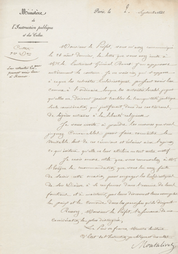 Dans ce courrier du pair de France Camille de Montalivet (1801-1880), le « ministre secrétaire d’État de l’Instruction publique et des cultes » suggère au préfet d’Ille-et-Vilaine Pierre Thomas le Roy de Boisaumarié (1773-1837) de recommander à l’évêque du diocèse « d’engager les ecclésiastiques de son diocèse à se renfermer dans l’exercice de leurs fonctions et à maintenir par leurs discours et leurs exemples la paix et la concorde dans les paroisses qu’ils dirigent ». Il réagit à la mission qui vient d’avoir lieu à Saint-Malon-sur-Mel (Ille-et-Vilaine) sans autorisation préfectorale. Si l’affaire est mineure, le nouveau régime est dans l’obligation d’affirmer son autorité face aux ecclésiastiques nommés sous la Restauration. Ces derniers regrettent le roi du Sacre et surtout ils acceptent mal le fait que la religion catholique ne soit plus religion d’État. Si la monarchie de Juillet a modifié la Charte, elle se garde bien cependant de remettre en question le Concordat. Grâce à ce texte, les évêques sont en effet choisis par le gouvernement, qui nomment ensuite les curés. L’exécutif est aussi en mesure de suspendre le traitement de desservants, prêtres ou d’évêques dont les déclarations auront déplu. Pour vaincre les réticences du clergé, préfets et sous-préfets sont amenés à rappeler régulièrement aux curés de leurs circonscriptions qu’ils sont dans l’obligation de prier pour le nouveau « Roi des Français » Louis-Philippe : Domine salvum fac regem nostrum (« Seigneur, sauve notre roi »).